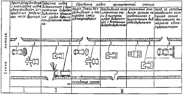 Машинист статического катка (5 разр.) подкатывает щебень на I захватке и доуплотняет основание на III захватке; машинист кулачкового катка (5 разр.) вдавливает пескоцементную смесь на III захватке.