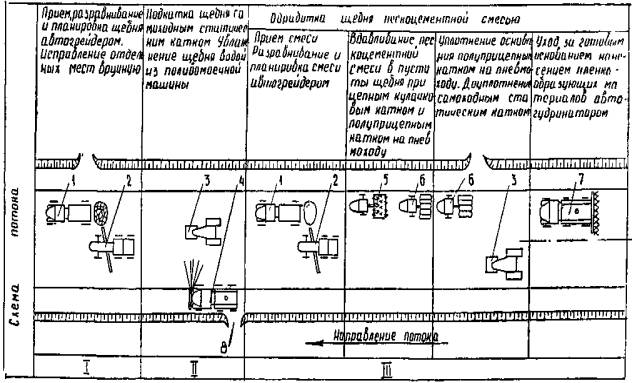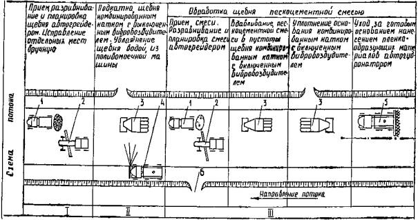 укрепленных неорганическими вяжущими», Основные положения правил техники безопасности приведены в картах сборника. Каждая технологическая карта предусматривает состав звеньев рабочих и перечень технических средств, необходимых для выполнения работ. Рабочие и машины, занятые на доставке материалов (автомобили-самосвалы, поливомоечные машины, автогудронаторы), в состав рабочих звеньев не включены, их потребность определяют по расчету в зависимости от дальности возки материалов. Количество передвижных электростанций для освещения участков работ и количество заправочных машин определяют по потребности. При привязке технологических карт к местным условиям необходимо учитывать конструкцию покрытия и способы вдавливания пескоцементной смеси в пустоты верхней части щебеночного слоя. ТЕХНОЛОГИЧЕСКАЯ КАРТА №