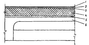 Рис. 1. Конструкция кровли: 1 - бронирующий слой; 2 - трехслойный рубероидный ковер; 3 - асфальтовая стяжка; 4 - теплоизоляция; 5 - пароизоляция; 6 - железобетонная плита II. УКАЗАНИЯ ПО ТЕХНОЛОГИИ ПРОИЗВОДСТВЕННОГО ПРОЦЕССА1. К устройству кровли приступают после монтажа плит покрытия, замоноличивания стыков между ними и установки вентиляционных шахт. 2. До начала работ должны быть установлены и испытаны подъемно-транспортные механизмы, а также завезены на объект инвентарь, оборудование и приспособления. При этом должна быть проверена их исправность; бригада рабочих должна быть ознакомлена с порядком выполнения работ. 3. Штучные материалы и изделия (рубероид, плиты утеплителя, лесоматериал) завозят на объект и подают на рабочее место комплектами в контейнерах, а раствор, бетон, асфальт - в бункерах. 4. Для подъема материалов и изделий рекомендуется применять два двустоечных подъемника Т-37, расположив их посредине продольных стен здания. 5. Наклейку рулонного ковра производят одновременно двумя катками-раскатчиками конструкции треста «Оргтехстрой» Минпромстроя БССР. 6. Мастику для наклейки рулонного ковра доставляют на строительную площадку автогудронатором и сливают в бункеры, установленные на инвентарные металлические салазки. Подогретая в бункерах при помощи трубчатых электронагревателей (ТЭН) мастика перемешивается сжатым воздухом от компрессора марки О-38 и перекачивается по стоякам наверх в приемные плотно закрывающиеся бачки (рис. 2). Бачки подвозят к месту работ на тележках.
