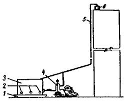 Рис. 2. Схема подачи мастики на крышу: 1 - салазки; 2 - ТЭНы; 3 - бункер; 4 - растворонасос; 5 - шланг; 6 - приемный бачок 7. Мастику для устройства обмазочной пароизоляции из автогудронатора перекачивают наверх по вертикальным стоякам, а затем по подключенным к ним шлангам подают к месту работы и наносят удочками на поверхность покрытия. 8. Кровлю устраивают в такой технологической последовательности: а) очищают плиты покрытия от мусора и пыли; б) наносят обмазочный слой пароизоляции; в) устанавливают по карнизу вкладыши из досок на ребро (кобылки); г) укладывают между кобылками пенобетон; д) настилают и прибивают к деревянным кобылкам дощатый настил по карнизу; е) устраивают свесы из оцинкованной стали; ж) укладывают насухо плиты утеплителя с заполнением стыков пенобетонной крошкой; з) укладывают (параллельно