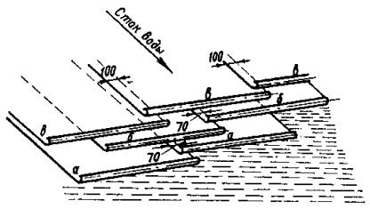 ширине должна составлять в нижних слоях Каждый последующий слой укладывают так, чтобы скаты полотнищ предыдущего слоя приходились под среднюю часть верхнего полотнища (рис. 4). Нахлестку стыков полотнищ верхнего слоя выполняют по направлению господствующих ветров. 16. Стыки каждого слоя кровли пришпаклевывают мастикой. Особенно тщательно должны быть прошпаклеваны стыки верхнего слоя. 17. Каждый следующий слой кровли наклеивают после проверки и приемки нижележащего слоя, а защитный слой устраивают после проверки и приемки рулонного ковра.