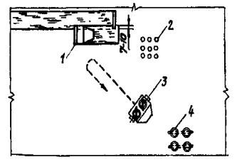 Рис. 6. Схема организации рабочего места звена кровельщиков: 1 - укладчик; 2 - рулонный материал; 3 - тележка для транспортирования кровельных материалов; 4 - бачки с мастикой В звене № 5 при устройстве асфальтовой стяжки два изолировщика (4 разр., 3 разр.) устанавливают рейки температурно-усадочных швов и укладывают асфальтовую смесь; изолировщик 3 разр. граблями разравнивает, а изолировщик 2 разр. подвозит асфальтовую смесь. В звеньях № 3 и 4 при устройстве теплоизоляции из пенобетона два изолировщика 4 разр. и два изолировщика 2 разр. укладывают пенобетон по карнизным свесам, изолировщики 3 разр. уплотняют его, а три изолировщика 2 разр. подвозят пенобетон на тележках. При устройстве теплоизоляции из пенобетонных плит изолировщики 4 и 3 разр. укладывают плиты на покрытие. По одному изолировщику 2 разр. из каждого звена заполняют зазоры между плитами пенобетонной крошкой. Остальные изолировщики 2 разр. подносят плиты к месту укладки. Расположение звеньев № 1-5 на кровле показано на рис. 7. После устройства теплоизоляции звенья № 3 и 4 переходят на устройство асфальтовой стяжки, а затем, закончив эту работу, вместе со звеном, занятым устройством асфальтовой стяжки, приступают к устройству бронирующего слоя. Стоечные подъемники обслуживают два машиниста 3 разр., а все погрузочно-разгрузочные и транспортные работы внизу на строительной площадке выполняет специальное звено, работа которого в технологической карте не учтена.
