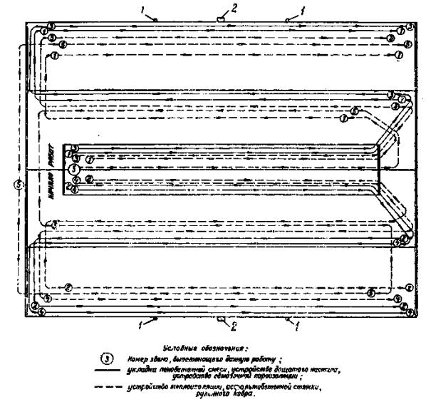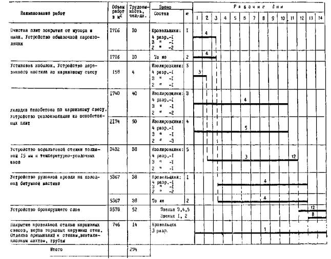 ковра температура холодной битумной мастики должна быть не ниже + 21. После наклейки рулонного ковра ходить по крыше разрешается только по уложенным деревянным щитам. 22. При выполнении работ рабочие должны быть обеспечены предохранительными поясами и нескользящей обувью. 23. Все работы должны выполняться согласно указаниям СНиП III-B.12-69. «Кровля», § 1, 2, 3, 7, и с соблюдением правил техники безопасности согласно СНиП III-A.11-62. «Техника безопасности в строительстве» (§ 16, пп. 1-3, 5-9). III. УКАЗАНИЯ ПО ОРГАНИЗАЦИИ ТРУДАРаботы по устройству кровли выполняет бригада из 21 чел. Звенья кровельщиков № 1 и 2 из четырех человек каждое (4 разр.-1; 3 разр.-1; 2 разр.-2) выполняют работы по устройству пароизоляции и по наклейке трехслойного рулонного ковра. Звено изолировщиков № 3 из четырех человек (4 разр.-1; 3 разр.-1; 2 разр.-2) и звено изолировщиков № 4 из пяти человек (4 разр.-1; 3 разр.-1; 2 разр.-3) выполняют работы по устройству теплоизоляции. Звено изолировщиков № 5 из трех человек (4 разр.-1; 3 разр.-1; 2 разр.-1) выполняет работы по устройству деревянного настила и асфальтовой стяжки. Один кровельщик 3 разр. заготовляет картины из кровельной стали и покрывает ими карнизные свесы, верх торцовых стен, а также обделывает примыкания к стенам, вентиляционным шахтам и трубам. В звеньях № 1 и 2 при устройстве