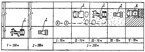 25- «Руководством по строительству дорожных асфальтобетонных покрытий», М., «Транспорт», 1978; «Техническими указаниями по устройству оснований дорожных одежд из каменных материалов, не укрепленных и укрепленных неорганическими вяжущими» ВСН 184-75, М., «Транспорт», 1976. При выполнении работ по устройству укрепленных обочин рулежных дорожек рабочие должны строго соблюдать требования и указания по технике безопасности, изложенные в СНиП III-A.11-70 «Техника безопасности в строительстве» (М., Стройиздат, 1970), «Правилах техники безопасности при строительстве, ремонте и содержании автомобильных дорог» (М., «Транспорт», 1978), «Типовой инструкции по технике безопасности для дорожных рабочих при строительстве автомобильных дорог», изд. 6 (М., Оргтрансстрой, 1976) и «Типовой инструкции по технике безопасности для асфальтобетонщика» (М., Оргтрансстрой, 1975). Основные положения правил техники безопасности при устройстве укрепленных обочин приведены в последнем разделе настоящего сборника. Карты операционного контроля качества работ по устройству оснований и асфальтобетонного покрытия укрепленной обочины отражены в разделе VIII каждой технологической карты настоящего сборника. Каждая технологическая карта сборника предусматривает состав звеньев рабочих и перечень технических средств (машин, оборудования и пр.), необходимых для выполнения работ на участке. Рабочие и машины, занятые на доставке строительных и горюче-смазочных материалов (автомобили-самосвалы, поливомоечные машины и др.), в состав рабочих звеньев не включены; их потребность определяют по расчету в зависимости от дальности возки материалов и объемов работ. При привязке технологических карт к местным условиям необходимо учитывать конструкцию покрытия и основания укрепленных обочин рулежных дорожек в зависимости от класса аэродрома. Работу бригад по устройству оснований и покрытия укрепленных обочин рулежных дорожек рекомендуется проводить по методу бригадного подряда, включая в комплексно-механизированные звенья (бригады) водителей автомобилей-самосвалов. ТЕХНОЛОГИЧЕСКАЯ КАРТА № 1устройство цементогрунтового основания из смеси, приготовленной в установке