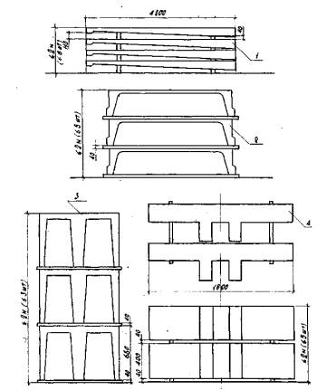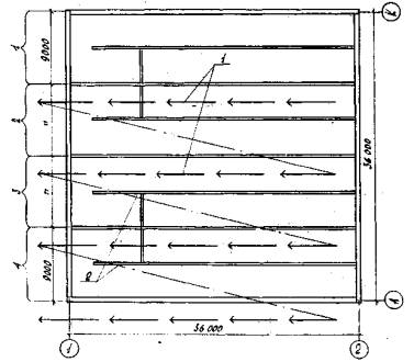 Бетонирование производить полосами шириной Бетон уплотнять виброрейкой длиной - установка маячных реек; - укладка бетонной смеси с разравниванием; - уплотнение бетонной смеси виброрейкой; - снятие маячных реек. Бетон, уложенный в жаркую солнечную погоду, следует немедленно накрыть. Во время дождя бетонную смесь защитить от попадания воды. Случайно размытый слой бетона следует удалить. Рис. 1. Схема организации работ по устройству четырехсекционного аэротенка: 1 - рабочий ход крана; 2 - холостой ход крана Рис. 2. Схема складирования конструкций: 1 - стеновые панели; 2 - плиты; 3 - лотки; 4 - опорные балки Рис. 3. Схема устройства бетонной подготовки: 1 - маячные рейки; 2 - уложенный бетон; 3 - виброрейка СО-47; 4 - автосамосвал Устройство бетонной подготовки должно сопровождаться соответствующими записями в журнале бетонных работ. Схема работ по армированию приведена на рис. 4. Подачу арматурных сеток к месту укладки производить пневмоколесным краном K-161. При укладке арматуры днища сначала укладывать нижние сетки на бетонные подставки. Подставки должны обеспечить проектную толщину защитного слоя бетона. Верхние сетки фиксировать на каркасах - подставках. Арматуру стыковать внахлестку на сварке. Приемку смонтированной арматуры, а также сварных стыковых соединений осуществлять до укладки бетонной смеси и оформлять актом освидетельствования скрытых работ. Работы по бетонированию днища вести