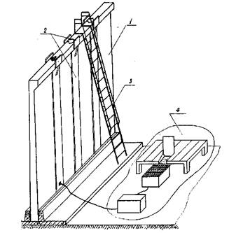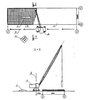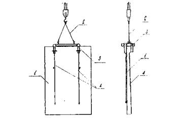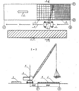 погружением стандартного конуса СтройЦНИЛа, в пределах 8 - Рис. 6. Схема монтажа стеновых панелей: 1 - стеновые панели; 2 - площадки складирования для стоянок 1-4; 3 - площадки складирования для стоянки 5; 4 - монтажный кран; 5 - рабочий ход монтажного крана; 6 - холостой ход монтажного крана; 7 - опасная зона хвостовой части крана; 8 - угловые панели; 17, 18, 19 - порядковые номера монтируемых стеновых панелей Рис. 7. Разрез I - I: 1 - стеновые панели; 2 - вилочный захват; 3 - двухветвевой строп; 4 - ось движения крана; 5 - гусеничный края; 6 - опасная зова хвостовой части крана Рис. 8. Схема строповки панели: 1 - стеновая панель; 2 - двухветвевой строп; 3 - траверса; 4 - цепной строп с замком Смаля Рис. 9. Схема заполнения стыков механизированным способом: 1 - стеновые панели; 2 - инвентарная опалубка; 3 - лестница МС 56-7-00; 4 - установка "Пневмобетон" с приставкой инженера Н. Марчукова Вязкость раствора должна обеспечивать