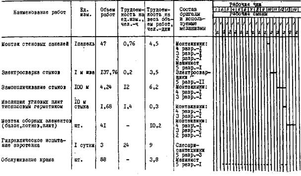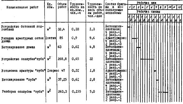 тиоколовый герметик; 4 - гернит диаметром 2.4. При производстве работ в зимних условиях соблюдать требования СНиП III-15-76" "Правила производства и приемки работ. Бетонные и железобетонные конструкции монолитные", СНиП III-16-80 "Правила производства и приемки работ. Бетонные и Железобетонные конструкции сборные", "Руководства по производству бетонных работ" и "Руководства по проектированию и строительству железобетонных емкостных сооружений с полносборными стенами с применением тиоколовых герметиков". Опалубку и арматуру перед бетонированием очистить от снега и наледи. Для антиадгезионного покрытия рабочей поверхности опалубки применять гидрофобизирующие смазки на основе продуктов нефтехимии, не загустевающие на морозе, солидольную. или петролатумнокеросиновую. Особенностью производства работ при отрицательных температурах воздуха является необходимость выполнения мероприятий, обеспечивающих минимальные потери тепла бетонной смеси от момента ее приготовления до укладки в опалубку конструкции. При заделке горизонтальных и вертикальных стыков стеновых панелей в зимних условиях в состав раствора и бетона вводят противоморозные добавки в количестве 4 - 7% массы воды затворения. Герметизацию стыков тиоколовыми мастиками необходимо выполнять в сухую погоду при температуре не ниже +5°С. 2.5. Работы по устройству аэротенков ведет бригада, состоящая из следующих звеньев: 1 звено: машинист 5 разр. - 1 (1) монтажник 4 разр. - 1 (2) монтажник 3 разр» - 1 (3) монтажник 2 разр. - 1 (4) 2 звено: арматурщик 4 разр. - 1 (1) арматурщик 2 разр. - 1 (2) арматурщик 2 разр. - 1 (3) арматурщик 2 разр. - 1 (4) электросварщики 5 разр. - 2 (1, 2) 3 звено: бетонщики-плотники 4 разр. - 2(1, 2) бетонщики-плотники 2 разр. - 2(3, 4) 2.6. График выполнения работ приведен в табл. 1. 2.7. Калькуляция трудовых затрат приведена в табл. 2. 2.8. Методы и приемы труда Бетонщик-плотник (1) устанавливает маячные рейки, определяющие проектную толщину подготовки. Бетонщик-плотник (3) принимает бетонную смесь, очищает лопатой кузов автосамосвала, укладывает бетон с частичной перекидкой. Бетонщик-плотник (1) разравнивает и уплотняет бетонную смесь виброрейкой. Бетонщик-плотник (3) снимает маячные рейки после твердения бетона. Заполнение оставшихся смежных полос выполнять аналогично. При установке арматурных сеток арматурщик (2) подготавливает арматурные сетки к установке - очищает их от пыли, грязи, ржавчины. Арматурщик (3) стропует пакеты арматуры и при помощи крана K-161 подает их к месту укладки. Арматурщик (4) подносит, укладывает и выверяет подкладки и совместно с арматурщиком (1) укладывает сетки. Арматурщик (1) выверяет установку сеток. Электросварщики (1, 2) производят сварку стыков арматурных сеток. Бетонирование днища выполняет звено бетонщиков. Бетонщик-плотник (2) проверяет правильность укладки арматуры и установки прокладок, обеспечивающих толщину защитного слоя бетона, устанавливает направляющие маячные рейки совместно с бетонщиком-плотником (2). Бетонщик-плотник (4) подает бетонную смесь из кузова автосамосвала в бункер, очищает лопатой кузов от остатков бетонной смеси. Бетонщик-плотник (2) принимает поданную в бункеры краном K-161 бетонную смесь и укладывает ее непосредственно на место, уплотняя совместно с бетонщиком-плотником (4) при помощи виброрейки. Бетонщик-плотник (4) укладывает бетонную смесь в опалубку "зуба", 