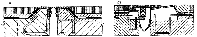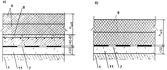 д) Схема № 4 - примыкание слоев одежды к окаймлению со стальным ребром окаймления высотой меньше, чем толщина слоев. Схема представлена в трех вариантах: - для случая с наличием железобетонного прилива перед ребром окаймления и отсутствием бетонного защитного слоя; - для случая без железобетонного прилива перед ребром окаймления и с бетонным защитным слоем (рис. 10, а); - для случая с переходной зоной на бетоне омоноличивания (рис. 10, б). В первом случае, когда к бетону примыкает покрытие толщиной ³110 мм с дренажем в уровне нижнего слоя (аналогично схеме, приведенной на рис. 5) и с переходным участком в уровне верхнего слоя покрытия, требования к материалу переходного участка, - по таблице 28. Во втором и третьем случаях предусмотрена пропитка бетонного слоя пропиточными составами, предусмотренными в разделе 7 (п. 7, д). Требования к материалу переходного участка для случая по рис. 10, а соответствует требованиям, приведенным в таблице 28. Для случая по рис. 10, б рекомендуется применять в переходном участке: - стандартный ЩМА 15 - в I и II строительных климатических зонах, независимо от интенсивности движения; - модифицированный асфальтобетон (см. Раздел 7), в I-III строительных климатических зонах при интенсивности до 10 тыс. а/с по одной полосе; - модифицированный ЩМА (см. Раздел 8) - в III-V строительных климатических зонах при интенсивности до 10 тыс. а/с по одной полосе; - мастично-щебеночную смесь, используемую для устройства деформационных швов закрытого типа с непрерывным покрытием - без ограничений.