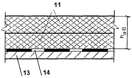 Из таблицы следует, что толщина выравнивающего слоя существенно влияет на размер (по вертикали) зоны омоноличивания конструкций деформационных швов, что дополнительно подтверждает целесообразность придания поперечного уклона проезжей части за счет постановки балок на опорные площадки разной высоты. На пролетных строениях с монолитной плитой выравнивающий слой, как правило, не устраивают. Выравнивающий слой может быть выполнен из мелкозернистого асфальтобетона типа Б марки I толщиной не менее 40 мм. При этом толщина слоя по ширине проезжей части должна быть постоянной по избежание недоуплотнения слоя. аIII) Преимущественное применение для гидроизоляции на железобетонной плите проезжей части имеют битумно-полимерные рулонные наплавляемые гидроизоляционные материалы. Их толщина 5 мм. Гидроизоляционные материалы, на которые непосредственно может быть уложено асфальтобетонное покрытие, должны иметь: - теплостойкость не ниже 130°С (под литой асфальтобетон - не ниже 150°С), прочность на растяжение при разрыве не менее 1000 kN (100 кгс) для полоски шириной 50 мм, - толщину битумно-полимерного нижнего слоя не менее 2,5 мм (при укладке уплотняемого асфальтобетона), - толщину верхнего слоя (при укладке литого асфальтобетона) - не более 1 мм; материалы должны быть испытаны на продавливание. Все прочие битумно-полимерные, полимерные напыляемые и рулонные резиноподобные гидроизоляционные материалы требуют устройства защитного бетонного слоя, армированного сварной дорожной сеткой. аIV) Защитный слой гидроизоляции выполняют из мелкозернистого армированного бетона толщиной 40-60 мм. Бетон должен иметь класс по прочности на сжатие не выше В30, марку по морозостойкости F300 при испытании в хлористых слоях, марку по водонепроницаемости не ниже W6. б) На пролетных строениях с ортотропной плитой проезжей части бI) На ортотропной плите конструкцию дорожной одежды выполняют состоящей из защитно-сцепляющего слоя и асфальтобетонного покрытия, укладываемого непосредственно на защитно-сцепляющий слой (рис. 5). Рис. 5. Конструкция дорожной одежды на ортотропной плите 11 - покрытие, 13 - лист ортотропной плиты, 14 - защитно-сцепляющий слой бII) Асфальтобетонное покрытие на мостовых сооружениях устраивают двухслойным. При применении уплотняемого асфальтобетона в общем случае покрытие выполняют из асфальтобетонной смеси типа Б марки I: в конструкциях одежд с защитным слоем над гидроизоляцией - толщиной не менее 70 мм; в конструкциях, где отсутствует защитный слой над гидроизоляцией, - толщиной не менее 110 мм. При применении в верхнем слое покрытия ЩМА (как правило, ЩМА 15 толщиной 40 мм) суммарная толщина покрытия должна быть не менее 90 мм. При применении в одном из слоев либо в обоих слоях литого асфальтобетона толщиной 40 мм суммарная толщина покрытия должна быть также не менее 90 мм; при применении асфальтобетона типа Б марки I в обоих слоях покрытия суммарная толщина покрытия должна быть не менее 80 мм. бIII) При применении для покрытия цементобетона толщина слоя покрытия, укладываемого на гидроизоляцию, должна быть не менее 120 мм. Бетон должен иметь класс по прочности на сжатие не ниже В35, W8, F300 в хлористых солях. При укладке особо плотного бетона, выполняющего функции гидроизоляции, дорожную одежду выполняют однослойной, совмещающей все функции в одном, так называемом, выр
