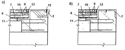 Рис. 6 2 - окаймление деформационного шва, 7 - гидроизоляция, 8 - защитный бетонный слой, 9 - покрытие, 10 - дренажный канал, 11 - выравнивающий слой, 12 - мастичное заполнение На рис. 6 приведен вариант сопряжения, предусматривающий в качестве переходного участка железобетон, в котором заанкерено окаймление с вертикальным ребром (а) или горизонтальной площадкой (б). К железобетону омоноличивания, который часто называют железобетонным приливом, примыкает традиционная конструкция одежды, состоящая из выравнивающего слоя, гидроизоляции, защитного слоя, двухслойного асфальтобетонного покрытия. В пределах толщины защитного слоя предусмотрен дренажный канал. При интенсивности движения свыше 8 тыс. автомобилей в сутки хотя бы по одной из полос движения перед бетонным приливом в уровне верхнего слоя покрытия (перед бетоном омоноличивания) устраивают переходной участок из более прочного асфальтобетона, чем на проезжей части моста. Ширину переходного участка принимают равной 0,30-0,50 м. Материал, используемый на переходном участке, должен отвечать требованиям, приведенным в таблице 27. Пример сопряжения приведен на рис. 7.