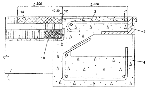 Рис. 7. Пример деформационного шва со схемой примыкания № 1 и переходным участком в уровне верхнего слоя покрытия 1 - несущая конструкция, 2 - окаймление деформационного шва, 3 - анкеровка окаймления, 4 - участок омоноличивания окаймления, 10 - дренажный канал, 12 - мастичное заполнение, 14 - переходный участок Материал переходного участка (к схеме № 1) Таблица 27