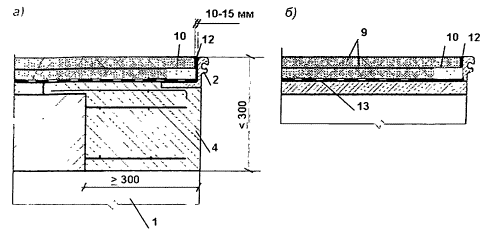 Рис. 9 Сопряжение одежды с вертикальным ребром окаймления: а) при железобетонной плите проезжей части; б) при ортотропной плите 1 - несущая конструкция (плита, балка, настил), 2 - Окаймление деформационного шва, 4 - участок омоноличивания окаймления, 9 - покрытие, 10- дренажный канал, 12 - мастичное заполнение, 13- лист ортотропной плиты, Материал переходного участка в верхнем слое покрытия