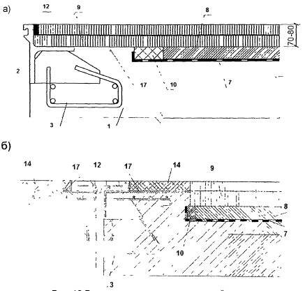 Рис. 10 Варианты примыкания дорожной одежды к деформационному шву по схеме № 4 1 - несущая конструкция, 2 - окаймление деформационного шва, 3 - анкеровка окаймления, 7 - гидроизоляция, 8 - защитный бетонный слой, 9 - покрытие, 10 - дренажный канал, 12 - мастичное заполнение, 14 - переходный участок, 17 - пропиточный слой