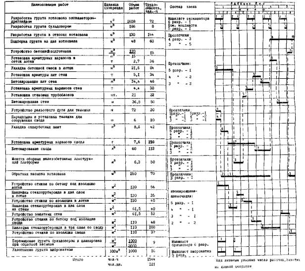 сечения котлована: III . УКАЗАНИЯ ПО ОРГАНИЗАЦИИ ТРУДАРазработка грунта экскаватором ведется со скоростью 1,5-2 пог. м станции в сутки. В смене работают машинист экскаватора 6 разр. и помощник машиниста 5 разр., который владеет профессией машиниста бульдозера 5 разр. Перед разработкой котлована производится снятие покрытия мостовой (асфальта, булыжника) и установка экскаватора на спланированной площадке, после чего машинист приступает к разработке грунта котлована и погрузке его в самосвалы. Помощник машиниста наблюдает за работой механизмов и подменяет машиниста во время отдыха. После разработки грунта на глубину 3-4 м экскаватор опускается в котлован и добирает оставшийся грунт. Разработка котлована ведется с устройством площадки для размещения экскаватора и съездов для автосамосвалов. Затем бульдозер опускается на дно котлована и добирает оставшийся после экскавации грунт до проектных отметок и перемещает его в зону действия ковша экскаватора. Окончательная подборка грунта и планировка дна и откосов котлована выполняется сквозной бригадой проходчиков, работающей в две смены по восемь человек в звене: проходчики 4 разр. - 3 (П4, П5, П6); проходчики 3 разр. - 5 (П9, П10, П11, П12, П13). Проходчики П5, П9 и П10 на одной и П6, П11 и П12 на другой стороне котлована одновременно ведут срезку оставшегося после экскавации грунта в откосах и сбрасывают его на дно котлована. Проходчики П4 и П13 разрабатывают грунт для устройства дренажной канавы. После оформления откосов звено в полном составе приступает к подборке грунта в лотке и планировке дна котлована и дренажной канавы код бетонную подготовку. Работы ведутся шестиметровыми заходками с опережением бетонных, гидроизоляционных и монтажных работ на 25-30 м. Техника безопасности Земляные работы в непосредственной близости к существующим сооружениям и коммуникациям подземного хозяйства следует производить под непосредственным наблюдением работника сменного надзора и представителя заинтересованной организации, а работы в непосредственной близости к кабелям под напряжением, кроме того, и под наблюдением дежурного электрика. При приближении работ к линиям действующих подземных коммуникаций (кабелей, напорных трубопроводов, газопроводов и др.) применять отбойные молотки, ломы, кирки, клинья и т.п. запрещается. Разрабатывать грунт вблизи кабелей, газопроводов и других подземных коммуникаций разрешается только лопатами. Выемки, разрабатываемые в местах передвижения людей и транспорта, должны быть надежно ограждены, а места работ, проходы и проезды освещены. На ограждении следует выставить предупредительные надписи и знаки, а в ночное время к ограждению должны быть прикреплены световые предостерегающие знаки. До начала земляных работ в котлованах и траншеях должны быть приняты меры по отводу ливневых и паводковых вод. При одновременной работе экскаватора и бульдозера в котловане на разработке грунта должна быть обеспечена безопасность людей, работающих на этих механизмах. Бульдозер должен находиться вне зоны действия ковша экскаватора. При погрузке грунта в кузов автосамосвала шофер должен находиться вне кабины автосамосвала. Хранить материалы в котловане на съезде, на рабочих местах и расстрелах запрещается. Каждую землеройную машину нужно оборудовать звуковой сигнализацией. Значения 