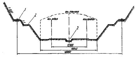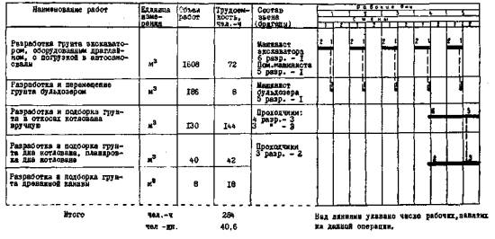 ТЕХНОЛОГИЧЕСКАЯ КАРТА № 2РАЗРАБОТКА КОТЛОВАНА ДЛЯ СООРУЖЕНИЯ СТАНЦИИ ОТКРЫТЫМ СПОСОБОМ РАБОТI. ОБЛАСТЬ ПРИМЕНЕНИЯТехнологическая карта составлена на разработку грунта экскаватором Э-652, оборудованным драглайном с ковшом емкостью 0,65 м3, с погрузкой грунта в автосамосвалы МАЗ-503 и КрАЗ. Подборка грунта в лотке после экскавации и грубая планировка выполняется бульдозером Д-271. Окончательная планировка дна котлована и откосов производится вручную. II. УКАЗАНИЯ ПО ТЕХНОЛОГИИ ПРОИЗВОДСТВЕННОГО ПРОЦЕССАК разработке котлована следует приступать после расчистки трассы от строений, устройства ограждения строительной площадки и водоотводных канав, укладки подъездных путей, перекладки всех подземных коммуникаций, пересекающих тоннель, прокладки трубопроводов для сжатого воздуха, воды и получения разрешения от организаций, эксплуатирующих городские подземные коммуникации. Устройство котлована ведется в три стадии: на первой стадии разрабатывается грунт на глубину 3-4 м с соблюдением крутизны откоса, предусмотренной проектом до уступа, на котором располагаются подкрановые пути козлового крана. На второй стадии выбирается грунт на 0,5 м выше проектной: отметки дна котлована с устройством промежуточного уступа. На третьей стадии бульдозером разрабатывается и подбирается оставшийся после экскавации грунт на дне котлована. Одновременно бригада проходчиков выполняет срезку грунта до проектного профиля откосов, планирует дно котлована и дренажной канавы с последующим устройством на дне котлована и канавы бетонной подготовки (рис. 1). Все работы по разработке грунта ведутся в соответствии с требованиями «Правил техники безопасности на строительстве метрополитенов и тоннелей» (Оргтрансстрой, 1975) и «Временных технических условий ВТУ-Т4-55 Минтрансстроя.