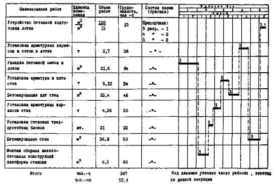ТЕХНОЛОГИЧЕСКАЯ КАРТА № 3ВОЗВЕДЕНИЕ МОНОЛИТНЫХ И СБОРНЫХ ЖЕЛЕЗОБЕТОННЫХ КОНСТРУКЦИИ СТАНЦИИ (ЛОТКА, ПЯТ, СТЕН И ПЛАТФОРМЫ)I. ОБЛАСТЬ ПРИМЕНЕНИЯТехнологическая карта разработана на сооружение из монолитных и сборных железобетонных конструкций односводчатой станции метрополитена с применением козлового крана ККТС-20. II. УКАЗАНИЯ ПО ТЕХНОЛОГИИ ПРОИЗВОДСТВЕННОГО ПРОЦЕССАДо возведения монолитного железобетонного лотка и стен станции должны быть выполнены следующие работы: разработан котлован по всему сечению на протяжении 50 м; выполнена срезка грунта после экскавации на откосах и дне котлована, а также планировка по отметкам на участке протяженностью 15-20 м; разработан грунт для устройства дренажной канавы; устроена бетонная подготовка лотка. При возведении конструкций выполняются следующие работы: устройство бетонной подготовки, армирование и бетонирование лотка (после выполнения гидроизоляции), армирование и бетонирование фундамента (пят) стен, армирование стен, установка стеновых блоков и бетонирование стен (рис. 2). Циклограммой производства работ учитывается время, необходимое для наклейки изоляции и устройства стяжек под изоляцию и по изоляции, а также время, необходимое для твердения бетона в лотке и стенах. При бетонировании стен применяется передвижная металлическая опалубка секциями длиной по 6 м, а для устройства дренажной канавы - переносная инвентарная металлическая опалубка. Армирование лотка, фундаментов (пят) и стен производится готовыми плоскими каркасами и сетками заводского изготовления. Доставка материалов в котлован (раствора, бетона, арматуры, блоков опалубки) производится при помощи козлового крана ККТС-20. Все работы по сооружению лотка и стен станции выполняются в соответствии с требованиями «Правил техники безопасности на строительстве метрополитена и тоннелей» (Оргтрансстрой, 1961) и «Временных технических условий производства тоннельных работ» (ВТУ-Т4-55, Минтрансстрой).