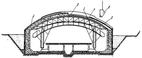 ТЕХНОЛОГИЧЕСКАЯ КАРТА № 4СООРУЖЕНИЕ МОНОЛИТНОГО ЖЕЛЕЗОБЕТОННОГО СВОДА СТАНЦИИI. ОБЛАСТЬ ПРИМЕНЕНИЯТехнологическая карта составлена на сооружение монолитного железобетонного свода односводчатой станции, сооружаемой открытым способом работ в котловане с откосами с применением передвижной металлической тележки и козлового крана ККТС-20. II. УКАЗАНИЯ ПО ТЕХНОЛОГИИ ПРОИЗВОДСТВЕННОГО ПРОЦЕССАДо возведения свода должны быть выполнены следующие работы: забетонированы лоток и пяты стен на участке длиной 50 м; забетонированы стены на участке длиной 30 м; установлены внутренние сборные железобетонные конструкции платформы на участке длиной 20 м; уложен рельсовый путь для тележки на участке длиной 24 м; смонтирована передвижная тележка. Продолжительность цикла 7 суток с учетом трехсуточной: периода твердения бетона. В технологическом процессе сооружения свода время вы стойки бетона учитывается в соответствии с требованиями СНиП III-В.1-70, предусматривающими снятие опалубки c apмированных несущими сварными каркасами конструкций после достижения ими 25% проектной прочности. Средняя скорость сооружения свода составляет 6 м в неделю или 25 м в месяц, затраты труда 68 чел-дн на 6 м, или 11,3 чел-дн на 1 м свода. В технологическую карту включены следующие работы: укладка рельсового пути для тележки; передвижка тележки, установка и крепление; устройство карниза; укладка опалубочных плит с заделкой швов цементно-песчаным раствором; установка и сварка арматурных каркасов и распредели тельной арматуры; укладка бетонной смеси в свод, установка и разборка наружной опалубки свода. Укладка рельсового пути для тележки производится на забетонированном лотке с креплением к закладным деталям. Уложенные пути выверяются инструментально маркшейдерской службой. Тележка для сооружения свода изготовляется на механическом заводе по специальным чертежам и оснащается гидроприводом и домкратами для регулирования ее положения при установке и креплении. Армирование свода выполняется плоскими каркасами, изготовляемыми на заводе из арматурной стали периодического профиля (рис. 3). Сборка каркасов и сварка производятся на месте. Сварку элементов каркаса между собой, а также к арматуре стен выполняет проходчик, владеющий профессией сварщика.