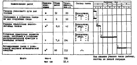 свода: Сборные опалубочные блоки свода являются одновременно облицовочными блоками, создающими архитектурное оформление на внутренней поверхности свода. Блоки укладывают на наружную поверхность тележки перед установкой каркасов и прикрепляют к армировке свода через монтажные петли. Укладка бетонной смеси производится беспрерывно по всей шестиметровой заходке равномерно с двух сторон в направлении от пят к шелыге свода. Бетонная смесь доставляется на строительную площадку с бетонного завода автосамосвалами с кузовом емкостью 2,65 м3, выгружается в ковши и подается к месту укладки козловым краном. Ковши емкостью от 1,5 до 3 м3 оборудованы вибрационным и винтовым устройством, регулирующим величину выгружающего отверстия. Перед укладкой бетонной смеси с наружной стороны свода устанавливается инвентарная металлическая или деревянная опалубка. Бетонная смесь уплотняется глубинными вибраторами. Все работы по сооружению свода выполняются в соответствии с требованиями «Правил техники безопасности на строительстве метрополитенов и тоннелей» и «Временных технических условий производства тоннельных работ (ВТУ-Т4-55, Минтрансстрой). III. УКАЗАНИЯ ПО ОРГАНИЗАЦИИ ТРУДАРаботы по сооружению свода выполняет комплексная сквозная бригада проходчиков, работающая в две смены. Численный состав бригады - 16 чел. Передвижка тележки Работы производит звено проходчиков в составе 4 чел.: 5 разр. - 1 (П2), 4 разр. - 1 (П6), 3 разр. - 2 (П11, П12). Механизмами при передвижке тележки управляет специально подготовленный машинист. По команде начальника смены машинистом включается гидравлическая система и освобождаются домкраты. Проходчики П2 и П11 на одной стороне и П6 и П12-на другой при помощи винтовых домкратов опускают тележку на рельсы. После освобождения домкратов машинистом включается гидравлическая система на поступательное движение, и тележка перемещается на новую заходку. При перемещении тележки проходчики очищают свод от наплывов раствора, устанавливают тележку в проектное положение и раскрепляют ее домкратами после выверки маркшейдерской службой. Укладка опалубочных плит Работы выполняются звеном в составе 6 проходчиков: 5 разр. - 1 (П2), 4 разр. - 2 (П6, П7), 3 разр. - 3 (П11, П12, П13). Перед установкой плит проходчики П6, П11, П12, П13 очищают наружную поверхность металлической опалубки от наплывов раствора. Проходчики П2 и П7 проверяют наличие плит, производят их отборку. При установке плит проходчики П2 и П11 стропуют и подают при помощи козлового крана плиты на место укладки. Проходчики П2 и П12 на одной, П7 и П13 - на другой стороне свода принимают и устанавливают плиты на место. Установка плит начинается с нижних рядов, опирающихся на карниз симметрично с левой и правой сторон свода. Проектное положение плит на наружной стороне опалубки фиксируется устройством на ее поверхности ячеек по размеру плит из уголкового железа, привариваемого к опалубке. Швы между плитами заделываются цементно-песчаным раствором. Армирование свода Армирование свода производится звеном проходчиков в составе 7 чел.: 5 разр. - 1 (П2); 4 разр. - 2 (П6, П7, П4), 3 разр. - 4 (П10, П11, П12, П13). Перед установкой арматуры проходчики П2 и П6 подбирают и комплектуют каркасы, проходчики П7, П10, П11, П12, П13 подносят из арматурного цеха в зону действия козлового крана распределительную арматуру, закладные детали, шпильки 
