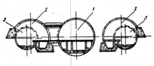 Рис. 7. Поперечное сечение путевого тоннеля станции: 2.3. Строительный процесс сооружения путевого тоннеля станции состоит из: 2.3.1. Проходки штолен на протяженность станции на разных отметках для сооружения опор свода тоннеля. Бетонирования в пройденных штольнях фундаментов с установкой металлоизоляции и арматуры. 2.3.2. Разрезки путевого тоннеля с установкой колец и сооружением монтажной камеры и монтажом оборудования, проходки станционного тоннеля на проектную длину с опиранием свода из сборных чугунных тюбингов на ранее сооруженные фундаменты с помощью дугового тюбингоукладчика специальной конструкции. 2.3.3. Выемки ядра грунта до лотка перегонного действующего тоннеля с установкой металлоизоляции и арматуры, монтажа плит платформ с обустройством подплатформенных кабельно-вентиляционных коллекторов. 2.3.4. Расчеканки швов, гидроизоляции болтов после завершения нагнетания. Монтажа асбоцементных зонтов с оштукатуриванием и побелкой. 2.3.5.. Монтажа металлокаркасов путевых стен станции с установкой кронштейнов под кабельные прокладки и перекладки кабелей, ранее уложенных в перегонных тоннелях на новые места. 2.3.6. Демонтажа части обделок перегонных тоннелей с удалением тюбингов по тоннелям метрополитенов. 2.3.7. Выравнивания уровня оставляемых тюбингов перегонного тоннеля в связи с тем, что обделка собиралась с перевязкой швов, путем установки сварных металлических коробок. 2.3.8. Завершения монтажных, облицовочных и строительных работ до полной готовности.