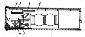 Рис. 1. Поперечное сечение станции: Сборник содержит две технологические карты. Карта № 1. Сооружение среднего зала станции. Карта № 2. Сооружение путевого тоннеля станции. Технологические карты должны быть привязаны к местным условиям строительного объекта по планировочным решениям проекта, геологии и гидрогеологии. 2. Технология и организация строительного процесса 2.1. К разработке разрезных колец среднего тоннеля при - ступают после завершения проходки подходных штолен, оборудования переподъемников, прокладки трубопроводов сжатого воздуха, вентиляции, водопровода и кабельных прокладок. Настилку путей выполняют с выходом на откаточной горизонт среднего тоннеля с оснащением электровозами. 2.2. Для монтажа тюбингоукладчика, технологических тележек проходится участок тоннеля с монтажом тюбинговых колец (с помощью электрических лебедок и подвесных полков для крепления лба забоя) и обуриванием забоя. (Рис. 2)