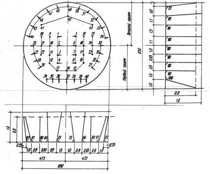 среднего станционного тоннеля: 2.2.1. Тюбингоукладчик ТУ-4ГП имеет выдвижные платформы, с которых проходчики ведут разработку грунта, и выдвижной козырек, который имеет усиленные решетчатые ограждения для защиты при взрывных работах. 2.3. В технологической карте заложена цикличная организация работ заходками 0,75 м. Цикл рассчитан на 16 ч с подготовительно-заключительной работой, технологическими перерывами и отдыхом. 2.3.1. График работ предусматривает следующие операции: подготовительные работы; разработку грунта буровзрывным способом; доработку грунта в лотке отбойным молотком; погрузку грунта породопогрузочной машиной ППМ-4М; установку временного крепления лба забоя; откатку груженых вагонеток из рабочей зоны и нормирование составов подкатку порожних вагонеток; передвижку тюбингоукладчиков, технологической тележки и ползушек; монтаж обделки тоннеля; нагнетание цементно-песчаной смеси за обделку тоннеля; укладку узкоколейного пути. 2.3.2. Грунт забоя разрабатывают буровзрывным способом (см. рис. 3) согласно паспорта буровзрывных работ с применением аммонита 6ЖВ и электродетонаторов коротко-замкнутого действия с шестью степенями замедления и частично в лотке в объеме 4 м3 - отбойным молотком. 2.3.3. Бурение шпуров производят перфораторами РПМ-17А до снятия временного крепления лба забоя. 2.3.4. В верхнем и среднем ярусах шпуры бурят с выдвижных площадок тюбингоукладчика, в нижнем ярусе - с подошвы забоя.