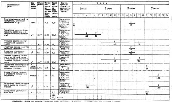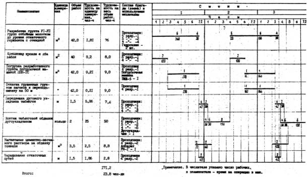 платформе: 2.10. Работы по сооружению путевого тоннеля станции на трассе действующих перегонных тоннелей без нарушения эксплуатации должны выполнять в строгом соответствии со СНиП III-44-77 "Правила производства и приемки работ, глава 44" Тоннели железнодорожные, автодорожные и гидротехнические. Метрополитены", М., Стройиздат, 1977, "Правилами техники безопасности и производственной санитарии при строительстве метрополитена и тоннелей". М., Оргтрансстрой, 1975 и Типовыми инструкциями Оргтрансстроя: по охране труда для проходчика (М., 1974), по охране труда для машиниста укладчика сборной обделки тоннелей (М., 1973), по охране труда для нагнетальщиков (М., 1972), по охране труда для откатчика (М., 1972). 2.11. Операционный контроль качества работ осуществляет начальник смены в соответствии с требованиями СНиП III-44-77 и КОКК настоящей технологической карты (раздел 5). 2.12. Работы по сооружению путевого тоннеля станции, сооружаемого над действующим перегонным тоннелем, выполняет сквозная комплексная бригада, состоящая из трех звеньев. Продолжительность рабочей смены составляет 7,2 ч. Работы выполняют без перерыва на выходные дни, с отдыхом по скользящему графику. График работ рассчитан на два кольца, 1,5 м. 2.12.1. Состав сменного звена: Проходчики: 6 разр. - 1 5 разр. - 2 4 разр. - 5 8 чел. 2.12.2. Проходчик 5 разряда имеет смежную профессию машиниста дугового укладчика тюбинговой обделки. Проходчик 4 разряда имеет квалификацию машиниста породопогрузочной машины. Проходчики 5 и 4 разр. во время предусмотренного графиком нагнетания цементно-песчаной смеси за обделку тоннеля работают нагнетальщиками. 2.12.3. Разработку грунта забоя производят заходками по 0,75 м (на цикл). В начальной стадии проходчики (6 разр. - 1, 5 разр. - 1 и 4 разр. - 3) разрабатывают грунт верхнего яруса забоя отбойными молотками либо забуривают шпуры и гидроклином разрушают крепкие грунты, а отбойными молотками дорабатывают. Два проходчика (5 и 4 разр.) подготавливают материал и производят временное крепление кровли и лба забоя. Временное крепление забоя представлено на паспорте, утвержденном начальником участка. 2.13.1. По окончании разработки верхнего яруса забоя и установки временного крепления проходчики (5 разр. - 1 и 4 разр. - 1) приступают к погрузке разработанного грунта и откатке вагонов к переподъемнику. 2.13.2. Разработку грунта УI и УII групп производят отбойными молотками с предоставлением проходчикам перерывов в работе для отдыха (как предохранительная мера от вредного влияния вибрации). 2.14. До передвижки дугового тюбингоукладчика проходчики (6 и 4 разр.) выполняют подготовительные работы (освобождение укладчика, проверку работы лебедки и роликов и др.). 2.15. Монтаж обделки начинают после передвижки дугового тюбингоукладчика, выверки правильности установки и закрепления. 2.15.1. Два проходчика (5 и 4 разр.) доставляют тюбинги к месту установки и откатывают освободившиеся тюбинговозки к переподъемнику. 2.15.2. 6 проходчиков (6, 5 и 4 разр.) с помощью электролебедки подтягивают тюбинг к месту установки, закрепляют установленный тюбинг и сболчивают. 2.15.3. Монтаж обделки производят с установки опорных тюбингов на анкеры бетонных фундаментов. Последующие тюбинги устанавливают поочередно на правой и левой сторонах. Замыкается обделка в своде установкой замкового тюбинга. Сболчивание тюбингов производят с помощью пневмосбо