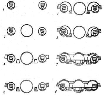 Рис. 4. Этапы работ по сооружению станционного тоннеля: 2.5.1. По окончании разработки и отгрузки грунта убирают защитный козырек и тюбингоукладчик передвигается к забою для монтажа очередного кольца отделки тоннеля (см. рис. 4). 2.6. Обделка тоннеля в глухих частях состоит из чугунных станционных тюбингов в количестве 16 шт. в кольце, из них нормальных - 13 шт. (СН), сменных - 2 шт. (СС) и замкового - 1 шт. (СК). 2.6.1. В проемной части среднего зала монтируют с каждой стороны по две чугунные перемычки, образующие верхний и обратный своды из тюбингов МРП2 - 2 шт., МРГЗ- 2 шт., МРП4 - 2 шт., МРП5 - 1 шт. Перемычки опираются на тюбинги МРП1 в количестве 6 шт., по 3 на каждую сторону. Для усиления конструкций пилонов вместо тюбингов СН устанавливают тюбинги МРП1 по 4 шт. с каждой стороны проема. (Рис. 5)