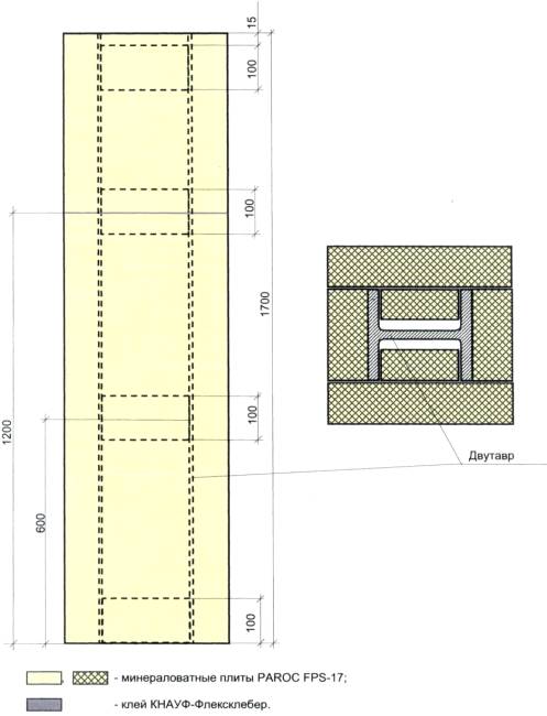 Рис. 1. Схема монтажа системы огнезащиты выполненной на основе минераловатных плит PAROC FPS-17 и клея КНАУФ-Флексклебер. Экспериментальные кривые прогрева стальных