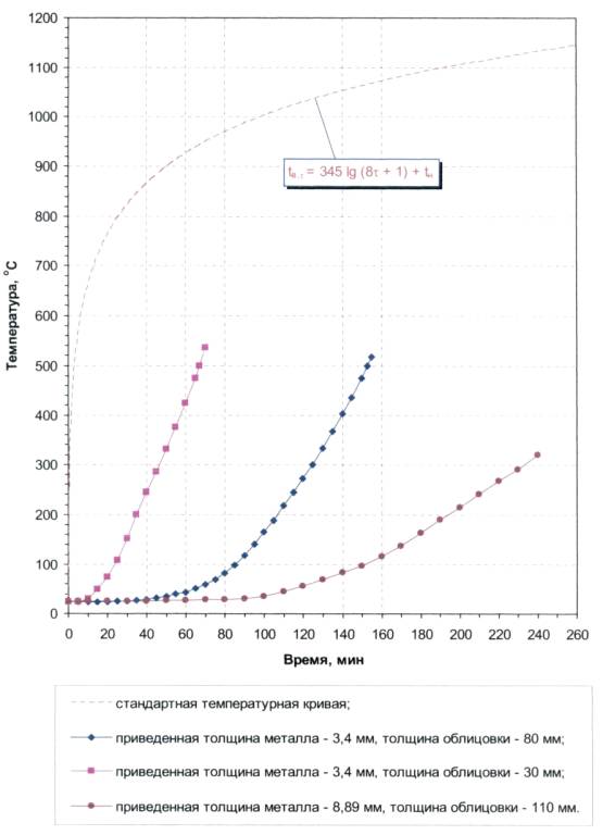 *- представленные данные получены в ходе проведения сертификационных испытаний системы огнезащиты на основе минераловатных плит PAROC FPS-17 и клея КНАУФ-Флексклебер для стальных конструкций (отчет № 6204 от 23.03.06 г.); **- на момент окончания огневого воздействия через 240 мин достижения критической температуры 500°С зафиксировано не было. Средняя температура на опытном образце составила 320°С. Результаты испытаний стальных конструкций с огнезащитой из минераловатных плит Раrос FPS-17 были проанализированы и обобщены. Температурные кривые прогрева испытанных конструкций с различными приведенными толщинами и толщинами облицовки показаны на рис. 2.