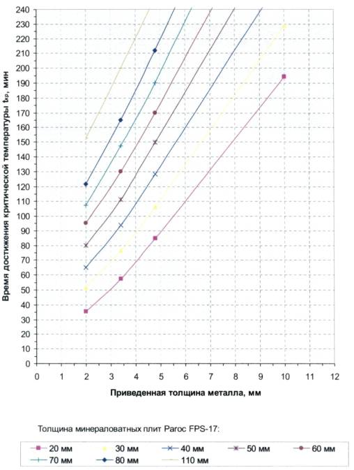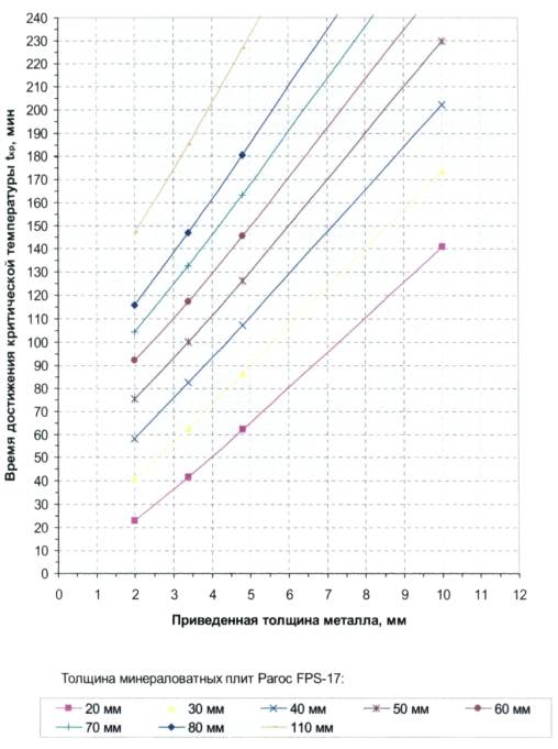 Рис. 2. 3.2. Приведенная толщина металла конструкцийДля представления сложной геометрии двухмерной конструкции в одном измерении необходимо использовать единый параметр для всех видов сечений - приведенную толщину металла, вычисляемую формуле: где F - площадь поперечного сечения металлической конструкции, мм2; П - обогреваемая часть периметра конструкции, мм. 3.3. Построение номограмм с использованием расчетного методаВ данной работе был использован расчетный метод определения прогрева стальных конструкций с огнезащитой, общие положения которого представлены в приложении. В результате сравнительного анализа данных по испытаниям были получены теплофизические характеристики материала облицовки из минераловатных плит Раrос FPS-17: плотность, влажность, степень черноты, коэффициент теплопроводности и коэффициент теплоемкости, - при нормальных условиях, а также при воздействии температурного режима. Для этого на ЭВМ было построено несколько моделей испытанных ранее конструкций и проведен ряд теплотехнических расчетов с использованием подобранных свойств материала минераловатных плит Раrос FPS-17. Сравнительные расчеты проводились до достижения среднего расхождения между результатами расчетов и испытаний не более 20 %. Теплофизические характеристики облицовки, полученные в результате анализа данных по испытаниям, далее были использованы для построения зависимостей (номограмм) огнестойкости стальных конструкций с огнезащитой из минераловатных плит Раrос FPS-17 при различных толщинах облицовки. Для расчетов на ЭВМ были построены модели стальных конструкций с огнезащитой из минераловатных плит Раrос FPS-17 с разными значениями толщин облицовки и приведенной толщины металла. Далее были проведены теплотехнические расчеты данных конструкций при воздействии температурного режима «стандартного пожара» и с использованием полученных свойств материала. За предел огнестойкости конструкции принималось время нагревания, по истечении которого средняя температура стальной конструкции достигала критической величины. Критическая температура tкр принималась для значений: 450°С, 500°С (по НПБ 236-97), 550°С и 600°С. В результате расчетов был получен ряд значений пределов огнестойкости конструкций при различных критических температурах tкр. Все эти данные были сведены в таблицы пределов огнестойкости конструкций для 4-х значений критических температур, по которым были построены номограммы огнестойкости стальных конструкций с огнезащитой из минераловатных плит Раrос FPS-17, рис. 3, 4, 5, 6. 3.4. Использование номограммНомограммы огнестойкости стальных конструкций с огнезащитой из минераловатных плит Раrос FPS-17 предназначены для определения пределов огнестойкости стальных конструкций при критических температурах стали: tкр = 450°С, 500°С, 550°С и 600°С, см. рис. 3, 4, 5, 6 соответственно. Огнестойкость стальных конструкций с огнезащитой из минераловатных плит Paroc FPS-17 при tкp =