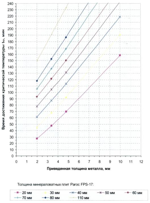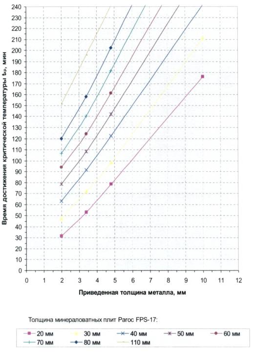 Рис. 3. Огнестойкость стальных конструкций с огнезащитой из минераловатных плит Paroc FPS-17 при tкp = Рис. 4. Огнестойкость стальных конструкций с огнезащитой из минераловатных плит Paroc FPS-17 при
