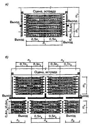 Распределение зрителей по направлениям движения с зрительских мест n в рядах m к выходам из зала следует принимать согласно схемам, приведенным на рисунке Ж.1 (а, б).