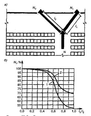 а - схема распределения потока численностью N, чел.; б - влияние соотношения между расстояниями до выходов на распределение количества людей из общего потока, направляющихся: 1 - к ближайшему (l1) из двух одинаковых выходов (наружу, в лестничные клетки, на открытые лестницы); 2 - к открытой лестнице (l1) или в лестничную клетку (l2).