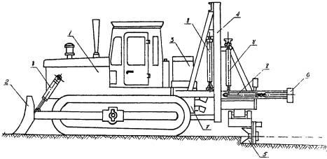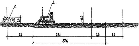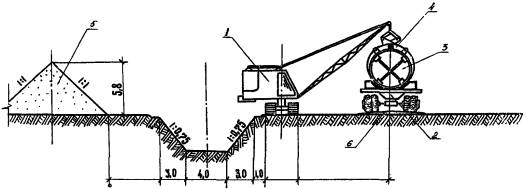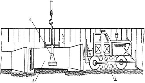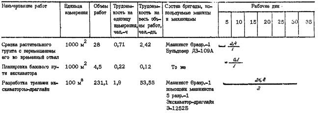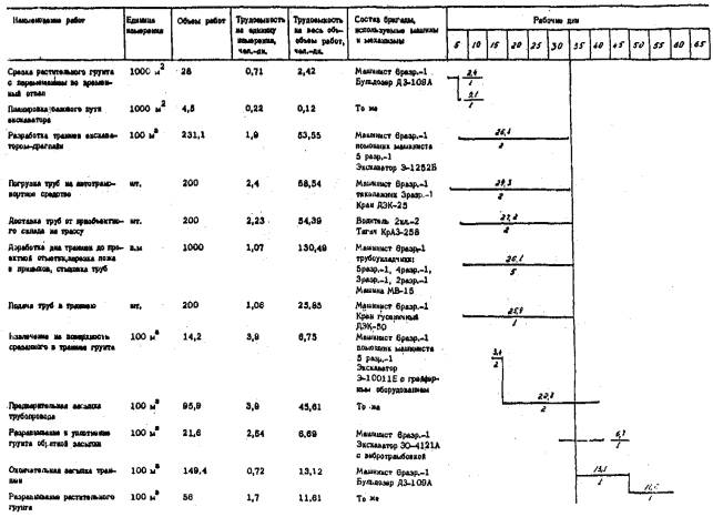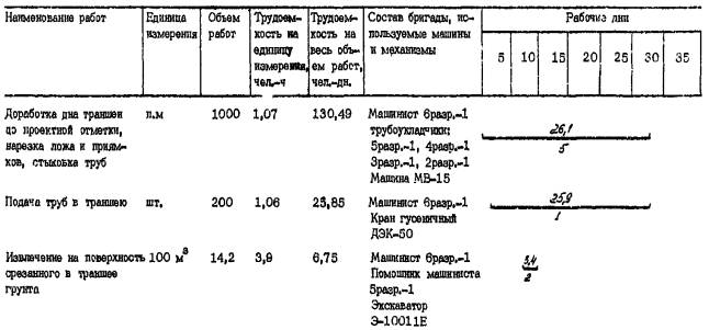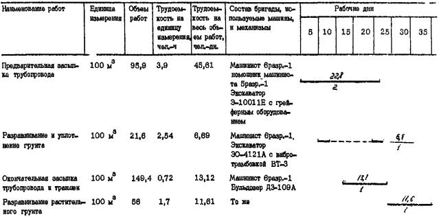 протяженностью 1.2. При строительстве трубопровода используются экспериментальные средства механизации, разработанные УкрНИИГиМ совместно с ВНИИЗеммаш. 1.3. Комплект охватывает все основные виды строительно-монтажных работ и включает следующие технологические карты: - на погрузочно-разгрузочные и транспортные работы; - на разработку траншеи; - на монтаж трубопровода; - на обратную засыпку трубопровода. После доводки экспериментального оборудования для гидравлических испытаний труб большого диаметра комплект будет дополнен технологической картой на испытание трубопровода. 1.4. Строительство ведется в летний период, режим работы - двухсменный. 2. ОРГАНИЗАЦИЯ ПРОИЗВОДСТВА РАБОТ2.1. При организации строительства необходимо учитывать следующие рекомендации: - строительство трубопровода следует вести поточным методом, основанным на комплексной механизации всех основных видов работ. При этом рабочие, участвующие в строительном процессе, объединяются в одну комплексно-механизированную бригаду, состоящую из специализированных звеньев и работающую по единому наряду; - для увеличения загруженности строительной техники, исключения ее простоев необходимо использовать машины универсального типа, имеющие различное сменное оборудование и позволяющие использовать его при выполнении нескольких видов работ. 2.2. До начала основных строительных работ необходимо провести следующие подготовительные работы: - разбить трассу трубопровода; - расчистить полосу отвода земли от деревьев, кустарника, камней и т.д.; - оборудовать строительный участок, включающий временные здания и сооружения для отдыха рабочих и складирования строительных материалов, площадку для стоянки машин и механизмов; - завести на приобъектный склад строительные материалы и оборудование. 3.