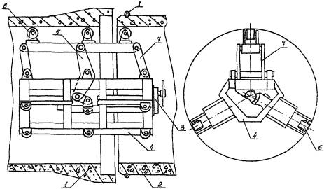1 - лапа, 2, 3 - рычаг; 4 - серьга; 5 - фиксатор; 6 - резиновые прокладки; 7 - регулируемый упор