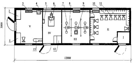 Рис. 2. Планировка здания для душевой Здание состоит из помещений: I - тамбур, II - преддушевое отделение, III - душевое отделение, IV - котельная, V - бельевая. В здании размещены: 1 - шкаф для белья, 2 - ящик для белья, 3 - нагревательный прибор, 4 - умывальник, 5 - насос для воды, 6 - котел отопительный, 7 - сетка душевая, 8 - мыльница, 9 - решетка, 10 - шкафчики для одежды, 11 - стул, 12 - ящик для топлива, 13 - гладильное устройство. Организационно-технологические решения на обустройство служебно-бытового центра в случае небольших объектов капитального строительства разрабатывают в составе ПОС этого объекта. При средних и крупных объектах разработку этих решений целесообразно, как показывает практика, выделять из состава ПОС на объект. На стройгенплане ПОС в этом случае обозначают площадку для служебно-бытового центра и составляют отдельные организационно-технологические документы: проект организации работ (ПОР) и проект производства работ (ППР) непосредственно для обустройства служебно-бытового центра. Рабочий проект на служебно-бытовой центр при этом может не разрабатываться, так как для его обустройства достаточно информации, содержащейся в упомянутых ПОР и ППР. ППР разрабатывают на основе данных, решений и указаний ПОР, однако в связи с тем, что временной промежуток между ПОР и ППР составляет, как правило, не менее полугода, данные и решения ПОР могут частично устареть. В этом случае решения ППР могут значительно отличаться от решений ПОР. Здания изготавливают с учетом технических условий, приведенных в ГОСТ 22853-86. Санитарно-технические системы в зданиях оборудуют согласно техническим условиям по ГОСТ 23345-84. Электротехническое оборудование устанавливают в зданиях по техническим условиям, изложенным в ГОСТ 23274-84*. Наиболее распространены в настоящее время