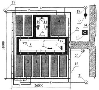 Рис 3. План служебно-бытового центра Экспликация мобильных зданий, инженерных сетей и элементов благоустройства к плану служебно-бытового центра 1 Гардеробная - 4 шт. 2 Душевая - 1/6 шт./сетка 3 Туалет - 1/6 шт./мест 4 Столовая - 2/16 шт./мест 5 Комната отдыха - 1 шт. 6 Офис на четыре рабочих места - 1 шт. 7 Стенд наглядной информации - 1 шт. 8 Щит средств пожаротушения - 2 шт. 9 Устройство для мытья обуви - 3 шт. 10 Место для курения - 11 Навес для отдыха - 12 Гидрант - 1 шт. 13 Контейнер для мусора - 1 шт. 14 Дорога сборно-разборная - 15 Дорожки пешеходные - 16 Ограждение сборно-разборное - 17 Въездные-выездные ворота - 1 шт. 18 Водопровод - 19 Теплоснабжение - 20 Электроснабжение - 21 Канализация - 5. Ведомость потребности в основных строительных изделиях и материалах. В ведомости (здесь не приводится) указывают в физических единицах результаты расчета потребности в фундаментных блоках для мобильных зданий, в железобетонных плитах - для подъездной дороги, в щитах ограждения служебно-бытового центра, в полимерных трубах, щебне, песке и других материалах. 6. Потребность в основных строительных машинах и транспортных средствах определяют с учетом их наличия и производительности, объемов строительно-монтажных работ по разделу 4. Результаты расчета сводят в ведомость (здесь не приводится). В связи с большим разнообразием на рынке строительных машин в проекте организации работ указывают не марки, модели и фирмы - изготовители машин, а их наименование, основные типоразмеры и параметры, по которым можно выбрать конкретные машины. Основные работы - землеройные и монтажные - выполняют, например, согласно типовому проекту, с применением, соответственно, бульдозера тягового класса 10 т и стрелового самоходного крана с грузовым моментом не менее 50 т·м. 7. Календарный план работ (здесь не приводится) составляют на основе объемов строительно-монтажных работ по ведомости раздела 4 и калькуляции затрат труда. Календарный план должен предусматривать (при соблюдении требований безопасности) совмещение этапов работ с целью сокращения общей продолжительности работ. 8. Потребность в энергетических ресурсах (в электроэнергии, топливе, паре, воде, сжатом воздухе) для работ по обустройству центра определяется в соответствии с методиками и нормативами для составления ПОС капитальных объектов. Результаты расчета сводят в таблицу (здесь не приводится). 9. Потребность в кадрах строителей (рабочих, инженерно-технических работников, младшего обслуживающего персонала и охраны) определяют по нормативам для составления ПОС капитальных объектов. Например, в типовом ПОР служебно-бытового центра на 50 чел. в результате расчета принято: общая численность работающих - 36, в том числе: рабочих - 30, инженерно-технических работников - 4, младшего обслуживающего персонала и охраны - 2 чел. 10. Потребность в бытовых помещениях. В этом разделе определяется потребность в бытовых помещениях для работающих на обустройстве служебно-бытового центра. Эти помещения размещают, как правило, в существующих зданиях и строениях или в мобильных зданиях центра, которые смонтированы в первую очередь. Расчет площадей выполняют общепринятым способом - умножением числа работающих на нормативы площадей, приходящихся на работающего. Ниже приводится, в качестве примера, фрагмент ведомости потребности в бытовых помещениях из типового п