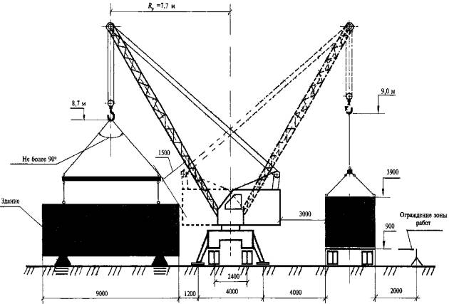 11. Основные технико-экономические показатели обустройства служебно-бытового центра. В этом разделе приводят обычно расчетные значения трудоемкости и продолжительности работ. Согласно, например, типовому проекту трудоемкость работ по обустройству центра составляет не более 90 чел.-дней, а продолжительность обустройства центра «под ключ» при 30 рабочих - не более трех дней. 6. СОДЕРЖАНИЕ И ОФОРМЛЕНИЕ ПРОЕКТА ПРОИЗВОДСТВА РАБОТ НА ОБУСТРОЙСТВО СЛУЖЕБНО-БЫТОВОГО ЦЕНТРАСодержание ППР на обустройство служебно-бытового центра в целом такое же, что и содержание ППР на объект капитального строительства. Основными являются разделы по организации и технологии производства работ, стройгенплан и указания по безопасному производству работ. Монтажные работы с применением грузоподъемного крана производятся по правилам РД-11-06-2007 Ростехнадзора. На стройгенплане в типовом ППР показаны: - направление перемещения и стоянки стрелового крана, горизонтальные и вертикальные привязки крана к выполнению монтажных работ по укладке дорожных плит, по установке в проектное положение фундаментов и мобильных зданий, по монтажу ограждения центра; - граница опасной зоны, возникающей от перемещения (вращения) поворотной платформы монтажного крана; - граница опасной зоны, возникающей от перемещения монтажным краном мобильных зданий и конструкций. Вертикальная привязка монтажного крана к установке мобильного здания «с колес» в проектное положение показана, в качестве примера, на рис. 4. В разделе по организации и технологии производства работ указывают общую последовательность, возможность совмещения и краткое описание строительно-монтажных работ. По типовому проекту, например, выполняются в общей последовательности с максимальным совмещением следующие строительно-монтажные работы: земляные работы, укладка временной подъездной дороги, установка ограждения площадки центра, устройство фундаментов под мобильные здания, перемещение и монтаж зданий на фундаменты, сборка и подключение инженерных сетей, устройство пешеходных дорожек и т.п.