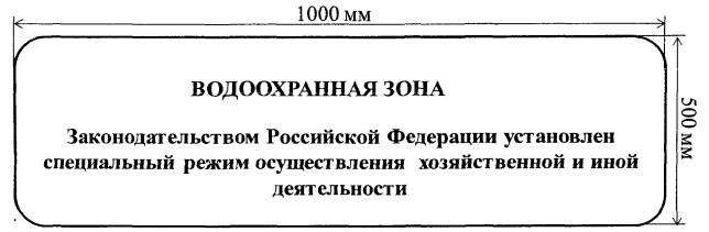 Примечание: Описание конструкций и материалов Специальный информационный знак "Водоохраная зона" (далее - Знак) для обозначения границ водоохранных зон представляет собой прямоугольник с соотношением сторон 2:1 со скругленными углами. Размер знака 500´1000 мм. Знак изготавливается из материалов, обеспечивающих достаточную устойчивость и прочность при эксплуатации к механическому воздействию, ветровой нагрузке, воздействию знакопеременных температур и иным климатическим факторам региона. Информационная надпись выравнивается по центру и наносится на Знак печатными буквами белого цвета. Текст, нанесенный на Знак, должен быть виден в светлое время суток с расстояния 50 метров. Фон знака должен иметь синий цвет. Приложение 2Образец специального информационного знака для обозначения границ прибрежных защитных полос водных объектов