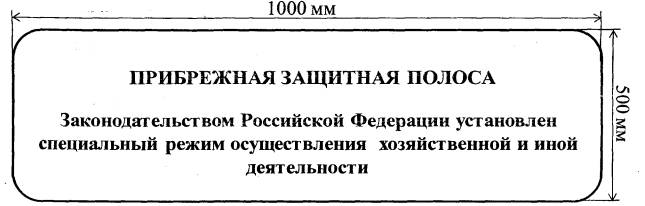 Примечание: Описание конструкций и материалов Специальный информационный знак "Прибрежная защитная полоса" (далее - Знак) для обозначения границ водоохранных зон представляет собой прямоугольник с соотношением сторон 2:1 со скругленными углами. Размер знака 500´1000 мм. Знак изготавливается из материалов, обеспечивающих достаточную устойчивость и прочность при эксплуатации к механическому воздействию, ветровой нагрузке, воздействию знакопеременных температур и иным климатическим факторам региона. Информационная надпись выравнивается по центру и наносится на Знак печатными буквами белого цвета. Текст, нанесенный на Знак, должен быть виден в светлое время суток с расстояния 50 метров. Фон знака должен иметь синий цвет.