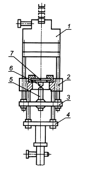 где Пд - число нитей или петель по длине; Пщ - число нитей или петель по ширине; Т - линейная плотность нитей, текс. 5.4.8 По согласованию изготовителя с потребителем допускается определять прочность при растяжении по приложениям А, Б. 5.4.9 Протокол испытаний должен содержать данные, приведенные в приложении 3. 6 Определение прочности при продавливании шариком6.1 Отбор и подготовка элементарных проб 6.1.1 Для определения прочности при продавливании шариком из каждой точечной пробы вырезают по диагонали пять элементарных проб диаметром 60 мм. Допускается элементарные пробы вырезать по всей ширине точечной пробы. 6.2 Аппаратура Для проведения испытания применяют разрывную машину, в которой верхний и нижний зажимы заменяют специальным приспособлением (см. рисунок 1). Приспособление состоит из двух соединенных рам. Верхнюю раму разрывной машины закрепляют в верхний зажим.