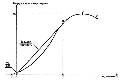 Для вычисления текущей жесткости, выражаемой в килоньютонах на метр при заданной деформации, определяют нагрузку при этой заданной деформации (точка В на рисунке 1) по формуле