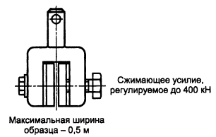 d) Конструкция захватов, пригодная для испытания геотекстиля из расплава полимера