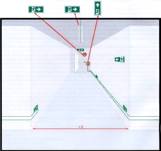 Рисунок 3 - Пример указателя направления к обозначению этажа и напольной разметке 6.5.3 Точное значение указателя направления всегда зависит от места установки. Особое внимание должно быть обращено на изменение направления движения, на обозначение промежуточных дверей, через которые люди проходят вдоль маршрута эвакуации и на маршруте эвакуации, требующие перехода на верхний уровень в здании. 6.6 Знаки маршрута эвакуации и указателей направления к ближайшему выходу или площадке безопасности 6.6.1 За ожидаемый период эксплуатации знаки маршрута эвакуации и указателей направления должны давать четкую, заметную и однозначную информацию о направлениях, видную со всех возможных мест маршрута эвакуации и с прилегающих участков. Эти знаки маршрута эвакуации и указателей направления должны следовать вплоть до безопасных участков или площадок сбора. Чтобы исключить замешательство и неуверенность, визуальная презентация направляющих линий должна быть как можно более непрерывной, а количество мест разрыва минимальным. 6.6.2 Компоненты системы указания направления должны быть расположены так, чтобы помочь избежать возможных рисков для людей. 6.6.3 Высокорасположенные знаки выхода должны быть установлены на всех выходах, предназначенных для использования в чрезвычайных ситуациях, а также там, где необходимо, вдоль маршрута эвакуации, для указания направления к следующему выходу, безопасному участку, площадке сбора, а также, чтобы указывать положение маршрута эвакуации для людей в прилегающих участках. Там, где в пределах видимости невозможно прямое наблюдение знака эвакуационного выхода, должны быть указатели направления к выходу, чтобы помогать движению к эвакуационному выходу. Максимальное расстояние между знаками маршрута эвакуации должно быть 5 м. Указатели направления могут быть укреплены на стене или подвешены для обеспечения точной информации о направлении. Напольные указатели направления должны быть такими, как на рисунке 3. Дополнительная информация, такая как расстояние до выходов и разметка второстепенного пути, может быть включена в направляющие линии. Размер указателей направления на низкорасположенных направляющих линиях должен быть таким же, что и направляющие линии пути, не менее 50 мм. 6.6.4 Низкорасположенные направляющие линии с информацией о направлении должны быть размещены в дополнение к высокорасположенным знакам вдоль всего пути для его четкого обозначения. Разрывы не должны превышать 0,2 м, если только вдоль маршрута эвакуации нет дверей; в противном случае напольная или настенная направляющая линия может быть прервана с максимальным разрывом 1 м, или эти линии должны быть продолжены обводом на полу перед дверью. Створки дверей никогда не должны помечаться направляющей линией. Максимальная высота низкорасположенных знаков должна быть выше уровня пола на 0,4 м. Если низкорасположенная направляющая линия прерывается, ее можно продолжить на полу на протяжении этого разрыва. Указатели направления, как показано на рисунках 1 и 2, должны быть расположены с максимальными интервалами через каждые 5 м, а в критических точках, - как перекрестки и изменения направления, и чаще - вдоль всей длины направляющей линии. Указатели направления могут находиться прямо на стене, когда напольная направляющая линия нах