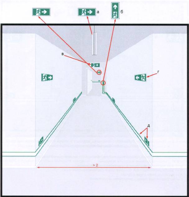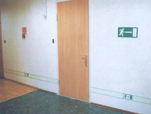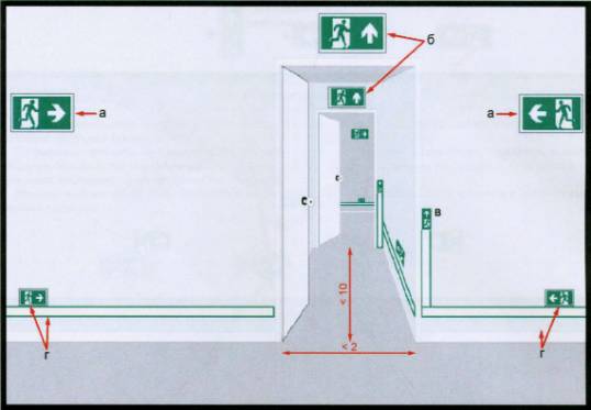 3.14 потенциально опасный объект: Объект, на котором используют, производят, перерабатывают, хранят или транспортируют радиоактивные, пожаро- и взрывоопасные, опасные химические и биологические вещества, создающие реальную угрозу возникновения источника чрезвычайной ситуации. [ГОСТ Р 22.0.02-94, статья 2.1.14] 3.15 предупреждающий знак: Знак, который символизирует безопасность, выраженную сочетанием цвета и геометрического размера и который при добавлении графического символа дает конкретное указание на безопасность. 3.16 путь эвакуации: Безопасный при эвакуации людей путь к эвакуационному выходу или месту размещения спасательных средств. 3.17 сигнальная разметка: Цветографическое изображение с использованием сигнальных и контрастных цветов, нанесенное на поверхности, конструкции, стены, перила, оборудование, машины, механизмы (или их элементы), ленты, цепи, столбики, стойки, заградительные барьеры, щиты и т.п., в целях обозначения опасности, а также для указания и информации. [ГОСТ Р 12.4.026-2001, раздел 3] 3.18 среднее расположение: Расположение элемента ФЭС на среднем уровне, между нижним расположением и верхним, особенно на уровне глаз, для предупреждающих знаков и других элементов ФЭС. 3.19 тупик: Путь, который не заканчивается эвакуационным выходом и не ведет к эвакуационному выходу или месту размещения спасательных средств. 3.20 фотолюминесценция: Свойство материалов светиться после возбуждения благодаря накоплению энергии на промежуточном энергетическом уровне. 3.21 фотолюминесцентная эвакуационная система, ФЭС: Совокупность фотолюминесцентных элементов, обеспечивающая заметную и четкую информацию и достаточные визуальные указатели, предназначенная для обеспечения эвакуации людей в случае возникновения чрезвычайной ситуации, в том числе при аварийном отключении освещения, а также для обеспечения ликвидации чрезвычайной ситуации. 3.22 фотолюминесцентный материал: Материал, обладающий свойством фотолюминесценции, которая может проявляться как во время возбуждения, так и в течение некоторого времени после окончания возбуждения светом естественного или искусственного происхождения. 3.23 цвет послесвечения: Цвет фотолюминесцентных знаков безопасности, сигнальной разметки и материалов после отключения источников света. [ГОСТ Р 12.4.026-2001, статья 3.13] 3.24 эвакуационный выход: Выход, используемый для эвакуации людей и ведущий наружу или в безопасную зону. Примечание - Эвакуационные выходы могут быть как основными, постоянно функционирующими для входа и выхода людей в обычной (штатной) ситуации, так и запасными, используемыми в условиях чрезвычайной ситуации. 4 Проектирование фотолюминесцентной эвакуационной системы4.1 ФЭС должна обеспечивать соответствующей понятной информацией находящимся в здании людям с тем, чтобы они могли организованно эвакуироваться из любого места. Примечание - ФЭС рассчитана на установку по всему зданию, но может ограничиваться определенными частями путей аварийного выхода, где это обосновано анализом риска. Фотолюминесцентные эвакуационные системы могут состоять из разных сочетаний возможных компонентов (знаков безопасности, символов ИМО, разметки дверей эвакуационных и аварийных выходов, сигнальной разметки обозначения опасных мест, планов эвакуации); требуемая конфигурация определяется при проек