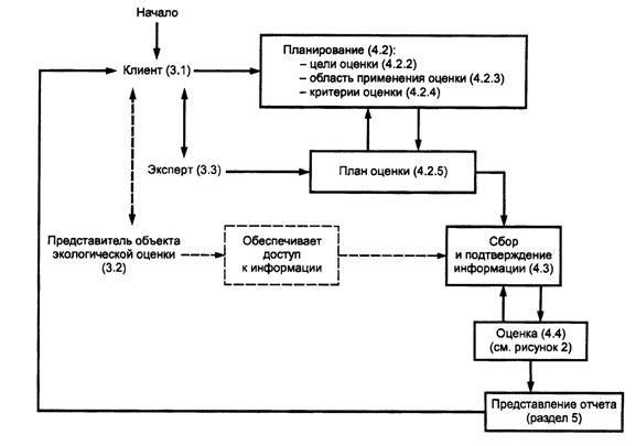 Дата введения - 2010-01-01 1 Область примененияНастоящий стандарт устанавливает руководство по проведению ЭОУО в процессе идентификации экологических аспектов и экологических выводов и обеспечивает определение их последствий для бизнеса. Настоящий стандарт также устанавливает роли и обязанности участников оценки (клиентов, экспертов и представителей объектов экологической оценки), этапы процесса оценки (планирование, сбор и подтверждение информации, а также оценку и подтверждение информации). Процесс проведения ЭОУО изображен на рисунке 1. Настоящий стандарт не распространяется на проведение других видов экологической оценки, таких как: a) первичная экологическая проверка; b) экологический аудит (включая проведение мероприятий по охране и рациональному использованию окружающей среды, аудиты соответствия регламентам); c) оценки экологических воздействий или d) оценки экологических характеристик. Настоящий стандарт также не распространяется на проведение интрузивных исследований и восстановление участков. Настоящий стандарт не может быть применен с целью сертификации и регистрации или установления требований для разработки мероприятий по охране и рациональному использованию окружающей среды.