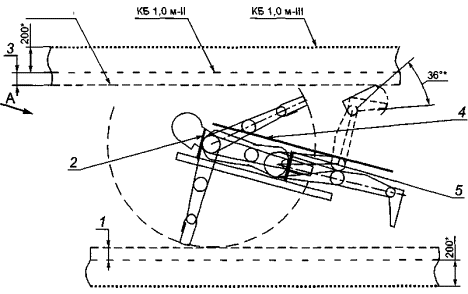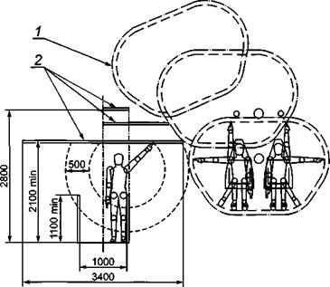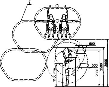 * Размеры для справок 1 - дополнительный зазор; 2 - дополнительный возможный ограничитель; 3 - дополнительный зазор; 4 - дополнительный возможный ограничитель; 5 - упор Рисунок 7 - Контуры безопасности для пассажиров, едущих лежа или под наклоном 5.8.6.1 Контуры безопасности для пассажиров, едущих сидя Обязательный контур КБ 1,5 м-I гарантирует травмобезопасность головы, но не гарантирует травмобезопасности конечностей. Для скоростей менее 3 м/с размер 500 мм заменяют размером 300 мм, при этом необходимо анализировать опасность травмирования головы и конечностей. Нормальный контур КБ 1,5 м-II гарантирует травмобезопасность головы и конечностей для больших скоростей при условии надежности устройств фиксации для пассажиров 95-го перцентиля. Контур КБ 1,5 м-II может быть уменьшен по усмотрению проектировщика, если имеются ограничивающие устройства для конечностей или если аттракцион рассчитан на детей с ограничением роста, что гарантировано контролируют в процессе эксплуатации. Максимальный контур КБ 1,5 м-III, который превышает нормальный контур на 200 мм, учитывает индивидуальные отклонения размеров людей или попытки пассажира дотянуться до частей аттракциона, в том числе при ослабленной фиксации. Применение контура КБ 1,5 м-I обязательно, при этом пассажиры аттракциона обязательно должны быть предупреждены о недопустимости высовывания рук за пределы тележки. Применение нормального или максимального контура - на усмотрение проектировщика. Рекомендуется уведомлять покупателей и пассажиров о типе применяемого контура. 5.8.6.2 Контуры безопасности для пассажиров, едущих стоя Для пассажиров, едущих стоя, устанавливают три аналогичных контура безопасности: КБ 2,5 м-I, КБ 2,5 м-II и КБ 2,5 м-III (см. рисунок 6), рассчитанных по принципам, аналогичным тем, в соответствии с которыми рассчитаны контуры для сидящих людей. Контур КБ 2,5 м соответствует размеру высоты до опасной зоны 2,5 м по ГОСТ Р 51334, пункт 4.2.1. Для скоростей менее 3 м/с проектировщик вправе применить уменьшенные контуры в соответствии с 5.8.6.1. 5.8.6.3 Контуры безопасности для пассажиров, едущих лежа Для пассажиров, едущих лежа (например, на животе), также устанавливают три контура безопасности КБ 1,0 м-I, КБ 1,0 м-II и КБ 1,0 м-III (см. рисунок 7), рассчитанные с учетом ограничений углов поворота конечностей в суставах и наличия дополнительных защитных ограничителей. Проектировщик вправе применить уменьшенные контуры в соответствии с 5.8.6.1. Контур КБ-III рекомендуется применять при движении тележек вблизи конструкций, декораций, деревьев и т.п., то есть в условиях, когда конструкции могут смещаться или деформироваться, дополнительно к этому контуру необходимо добавлять зазор 500 мм. В случаях использования на аттракционах других положений едущих пассажиров проектировщик должен применять контуры безопасности по аналогии с вышеуказанными. Если пассажирские модули не являются свободно перемещающимися, а двигаются по направляющим, их контуры безопасности не должны пересекаться. Кроме того, для пассажирских модулей, двигающихся во встречном направлении, рекомендуется применять дополнительный зазор между их контурами безопасности [см. рисунки 8а) и 8б)]. Если пассажирские модули перемещаются свободно и управляются пассажиром, то дополнительно должно быть соблюдено следующее расстояние: 120 мм от наружной поверхност
