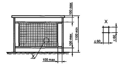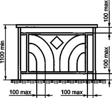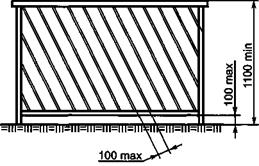 б) С учетом навесов 1 - контур безопасности пассажирского модуля; 2 - навес Рисунок 3 - Контуры безопасности посетителей относительно движущихся пассажирских модулей 5.8.4.5 Типы ограждений Ограждения должны быть спроектированы с учетом требований к нагрузкам, приведенным в ГОСТ Р 52170, таблица 1. Высота ограждений должна быть не менее 1,1м относительно поверхности, на которой стоят посетители, и с промежуточными перилами на меньшей высоте с учетом роста детей. Конструкция ограждений должна быть такой, чтобы взрослые посетители и дети не могли пролезть сквозь них или под ними. Если ограждаемый объект представляет собой значительную опасность, то застревание головы человека между элементами ограждения должно быть исключено. На аттракционах, предназначенных исключительно для детей до 10 лет, огораживаемые зоны которых расположены на одном уровне, допускается использовать барьеры высотой 0,85 м. Допускается использовать ограждения двух типов: а) обычные ограждения - с преимущественно вертикальными внутренними элементами [см. рисунок 4а)], при этом расстояние между двумя соседними элементами не должно превышать 100 мм. К ограждениям данного типа относятся ограждения, в качестве внутреннего элемента которых используется сетка [размеры см. на рисунке 4б)]; б) ограждения с внутренними декоративными элементами [см. рисунок 4в)]. Расстояние между двумя смежными элементами должно соответствовать приведенному на рисунке 4в). Элементы ограждений не должны иметь острых краев.