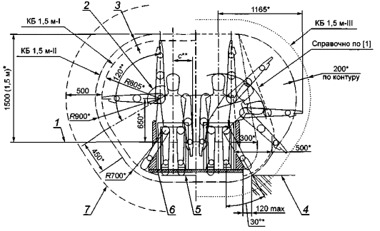 * Размеры для справок ** с = а(Р 95)/2, а(Р 95) = 545 мм (см. 4.2.10) 1 - уровень сиденья; 2 - возможный защитный ограничитель; 3 – дополнительный зазор; 4 - платформа; 5 - для подвешенной тележки; б - пол кабины; 7 - дополнительный контур для деревьев, веток и других смещаемых препятствий Рисунок 5 - Контуры безопасности для пассажиров, едущих сидя 1) Перцентиль - часть упорядоченного набора наблюдений (вариационного ряда, частотного распределения), разделенного на 100 интервалов так, что в каждый интервал входит 1/100 часть (т.е. 1%) наблюдений. Например, 5-й перцентиль разделяет частотное распределение на две части, в одной из которых находится 5%, а в другой - 95% наблюдений. КБ 2,5 м-I - обязательный; КБ 2,5 м-II - нормальный; КБ 2,5 м-III - максимальный