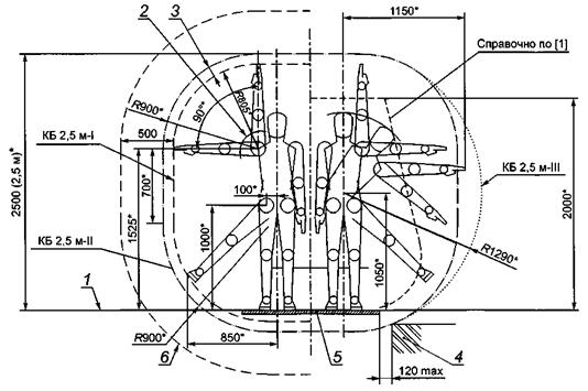 *Размеры для справок 1 - уровень пола;2 - возможный защитный ограничитель;3 - дополнительный зазор;4 - платформа; 5 - пол кабины; б - дополнительный контур для деревьев, веток и других смещаемых препятствий Рисунок 6 - Контуры безопасности для пассажиров, едущих стоя КБ 1,0 м-I - обязательный; КБ 1,0 м-II - нормальный; КБ 1,0 м-III - максимальный